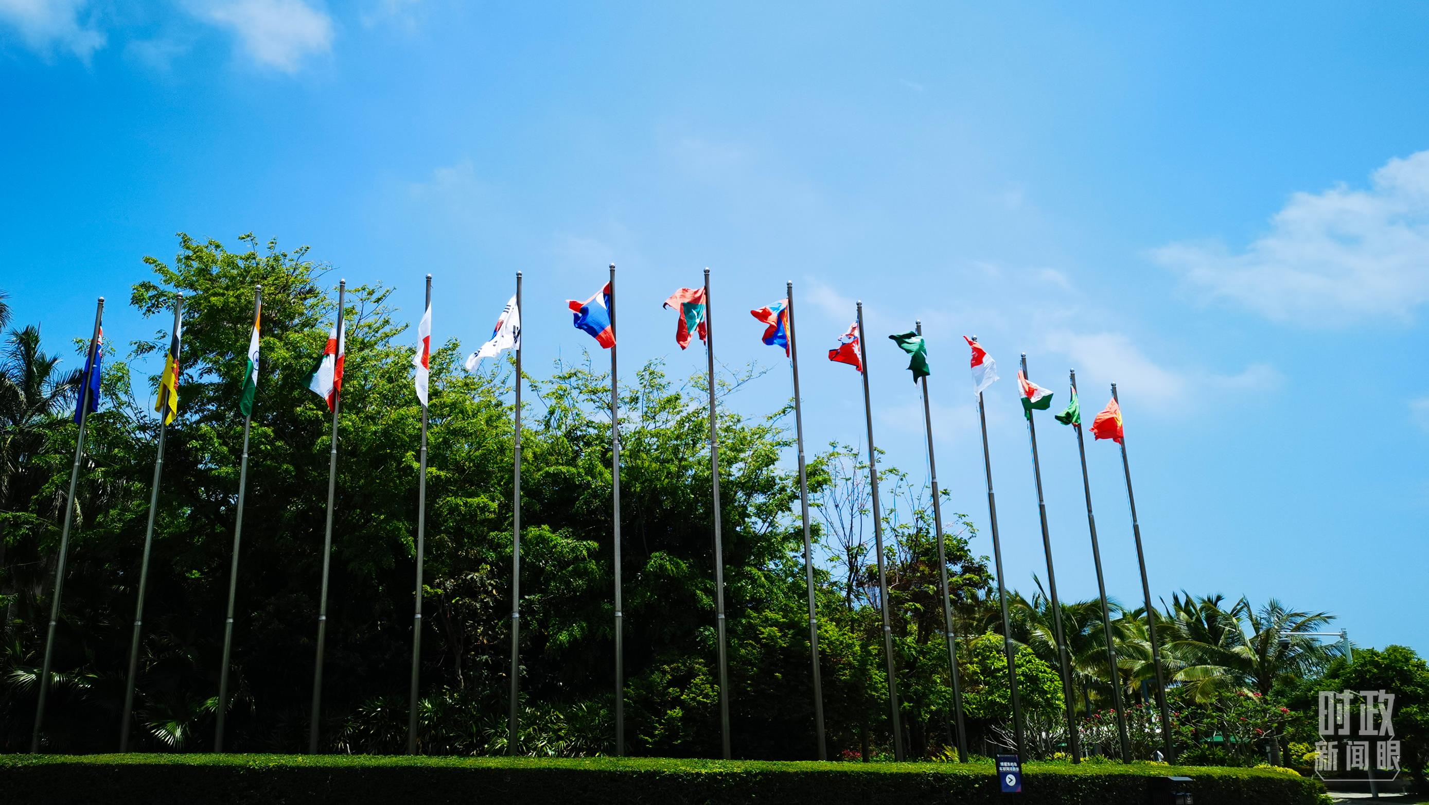 △多國國旗飄揚在博鰲亞洲論壇國際會議中心外。(總臺記者許云拍攝)