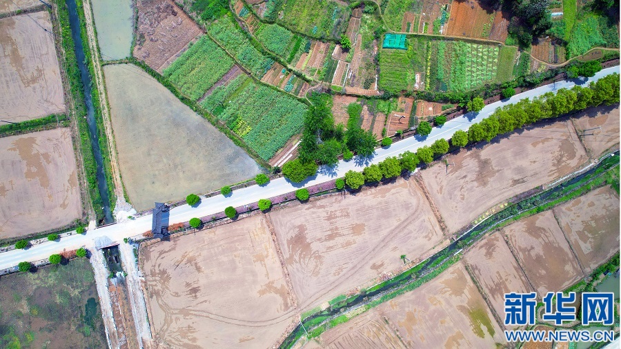 在江西省宜春市袁州區(qū)慈化鎮(zhèn)模山村,高標準農(nóng)田內(nèi)水網(wǎng)縱橫交錯,與村落、遠山形成一幅美麗動人的鄉(xiāng)村畫卷。新華網(wǎng)發(fā) 劉卿 攝