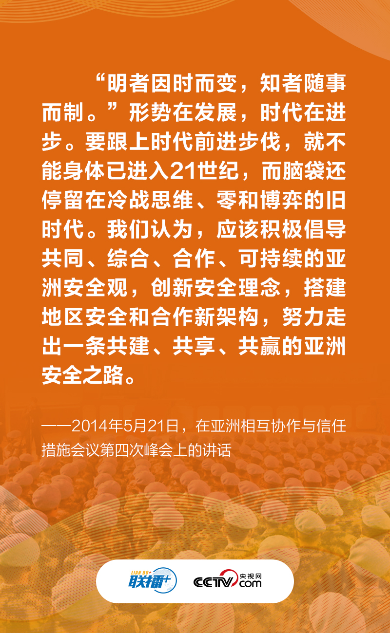 作為負(fù)責(zé)任的大國(guó),中國(guó)一直為維護(hù)世界和平、安寧與發(fā)展不懈努力。2014年5月21日,為促進(jìn)亞洲和平發(fā)展,習(xí)近平主席在亞洲相互協(xié)作與信任措施會(huì)議第四次峰會(huì)上提出踐行共同、綜合、合作、可持續(xù)的亞洲安全觀。此后,他在諸多國(guó)際場(chǎng)合多次倡導(dǎo)并不斷發(fā)展“共同、綜合、合作、可持續(xù)的安全觀”,為世界指引一條通往持久和平的康莊大道。央視網(wǎng)《聯(lián)播+》與您一起學(xué)習(xí)。