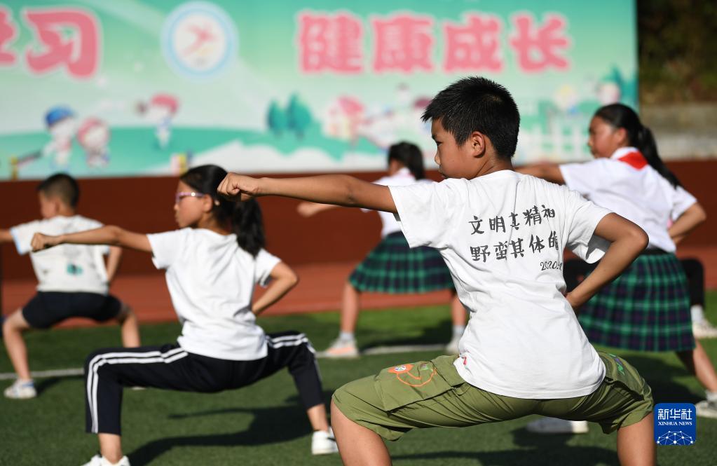 在陜西省安康市平利縣老縣鎮(zhèn)中心小學(xué)的操場(chǎng)上,學(xué)生們?cè)谡n后參加武術(shù)社團(tuán)活動(dòng)(2020年9月7日攝)。新華社記者 李一博 攝