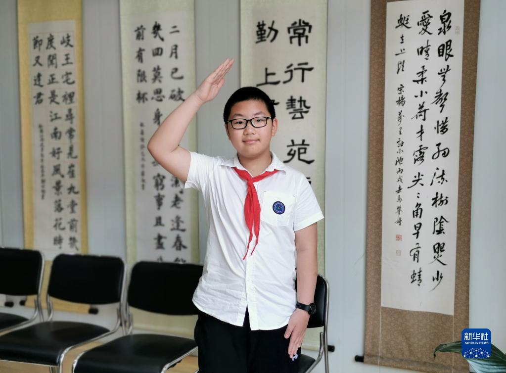 大陳島老墾荒隊(duì)員后代、浙江省臺(tái)州市椒江區(qū)實(shí)驗(yàn)二小學(xué)生李杭駿行隊(duì)禮(2019年5月27日攝)。新華社發(fā)(王衛(wèi)君 攝)