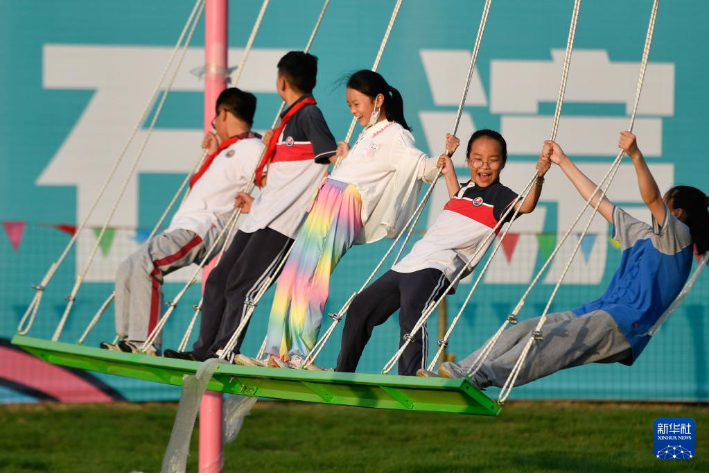 6月1日,小朋友在石淙花海的游樂區(qū)游玩。