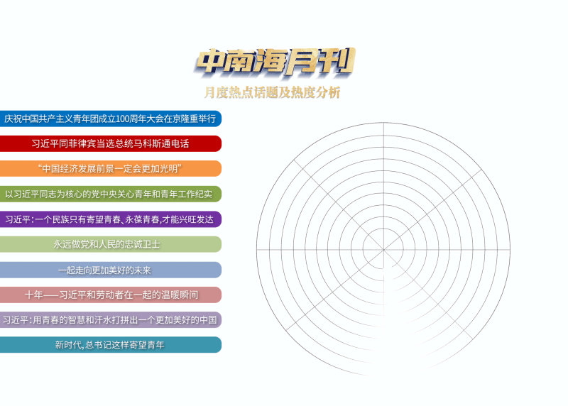 央視網(wǎng)“智聞”系統(tǒng)提取分析了2022年5月全網(wǎng)時政新聞熱點,慶祝中國共產(chǎn)主義青年團成立100周年大會備受網(wǎng)友關注,與之關聯(lián)的“以習近平同志為核心的黨中央關心青年和青年工作紀實”“用青春的智慧和汗水打拼出一個更加美好的中國”“新時代,總書記這樣寄望青年”等話題熱度很高。