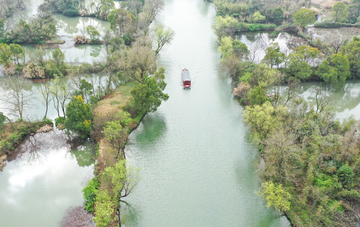 游船行駛在西溪濕地水道上(2021年3月2日攝,無人機(jī)照片)。新華社記者 翁忻旸 攝