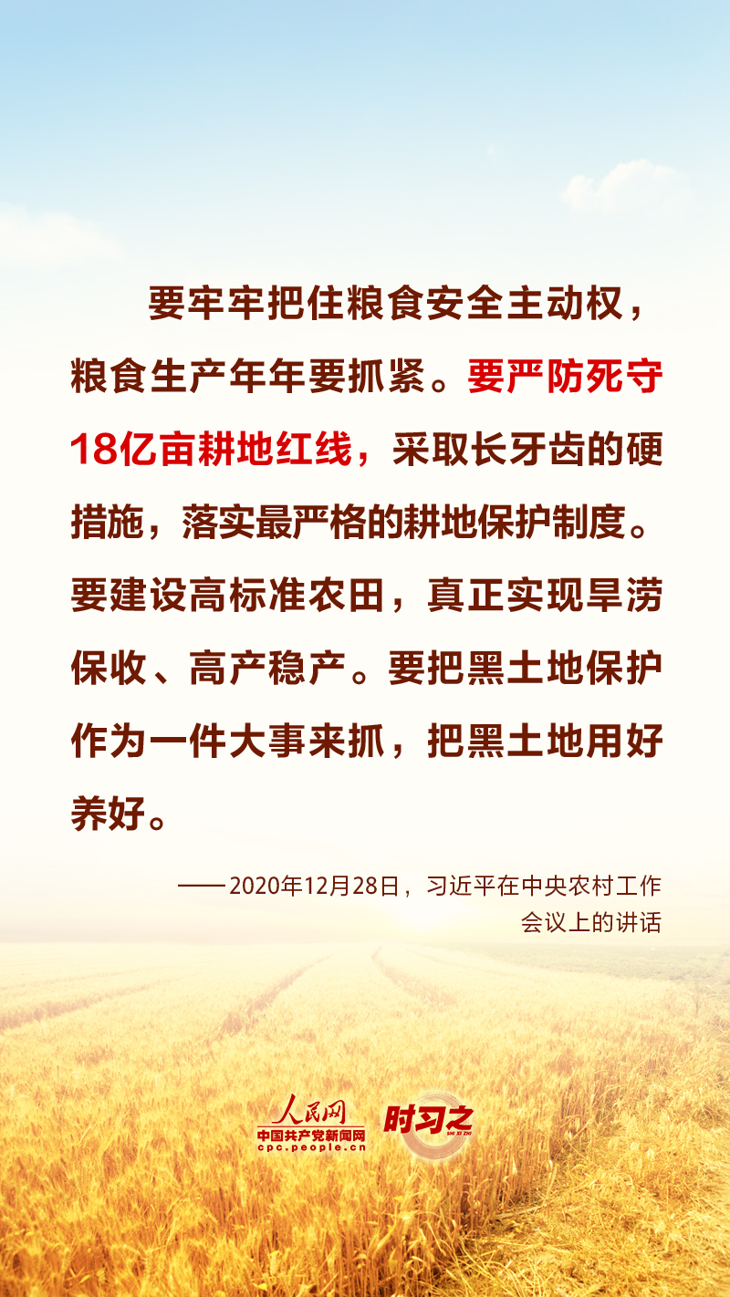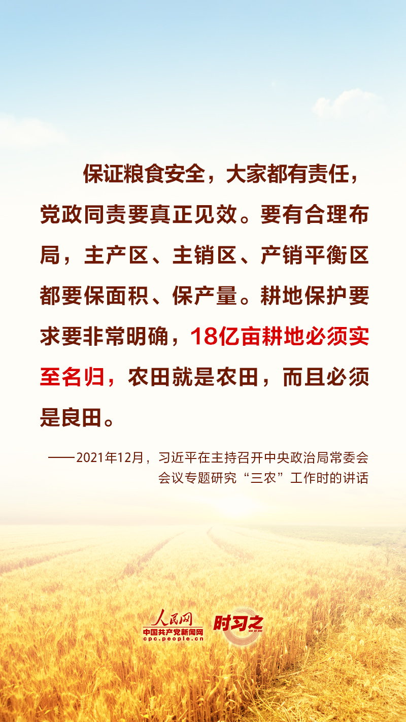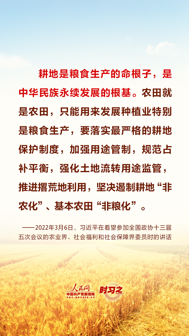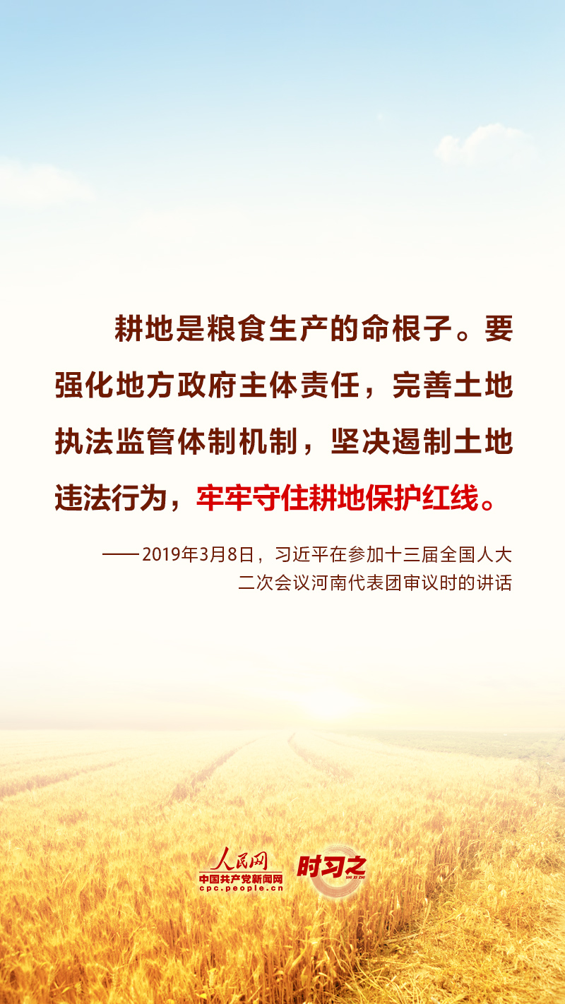 “民非谷不食,谷非地不生。”糧食安全在習(xí)近平總書(shū)記心中有著特殊的分量,他多次深入田間地頭察墑情、看苗情、問(wèn)收成,明確指出“耕地是糧食生產(chǎn)的命根子”。耕地是我國(guó)最為寶貴的資源,堅(jiān)持藏糧于地、端穩(wěn)中國(guó)飯碗,“希望的田野”終將麥浪滾滾、稻花飄香。