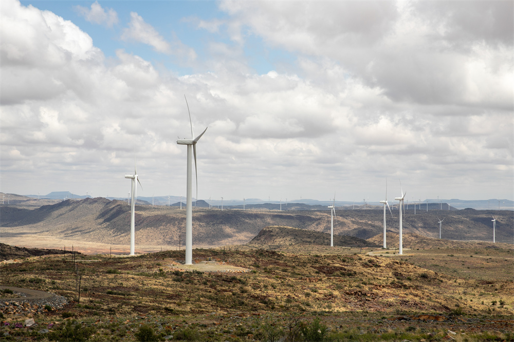 這是2021年11月22日在南非北開普省德阿鎮(zhèn)拍攝的中國龍源電力集團南非公司運營的德阿風電項目風機。新華社記者 呂天然 攝