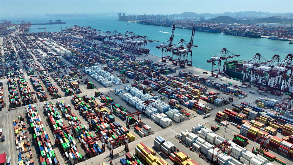 繁忙的山東港口青島港前灣港區(qū),集裝箱貨輪在裝卸集裝箱(6月15日攝,無人機照片)。青島海關(guān)數(shù)據(jù)顯示,今年1月至5月,青島直達金磚國家的航線共完成箱量83萬標箱,同比增長12%,其中出口量增長26.1%。新華社記者 李紫恒 攝