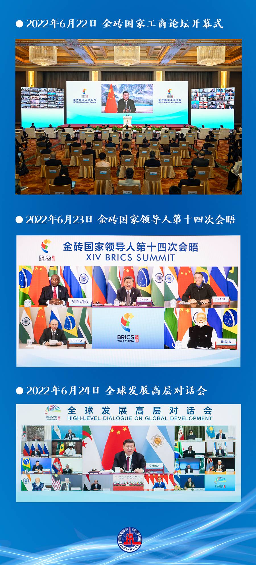 6月22日至24日,金磚“中國年”的高光時段,連續(xù)三個晚上,習(xí)近平主席以視頻方式相繼出席金磚國家工商論壇開幕式,主持金磚國家領(lǐng)導(dǎo)人第十四次會晤、全球發(fā)展高層對話會。