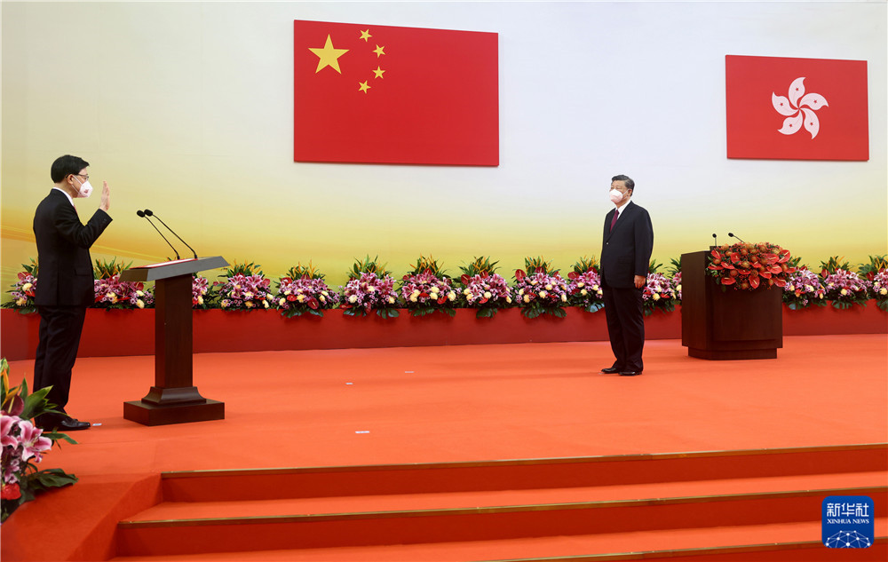 習(xí)近平主席監(jiān)誓,香港特別行政區(qū)第六任行政長官李家超、第六屆政府主要官員,舉起右手,莊嚴(yán)宣誓。