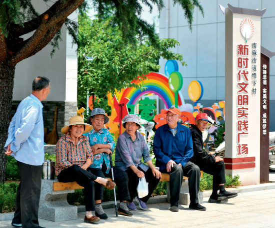 2022年6月15日,山東省沂源縣南麻街道埠下村村民在民生綜合體活動廣場休息。自2021年以來,沂源縣建設(shè)多處以老年食堂、公共浴室、中心村衛(wèi)生室(便民藥店)、便民超市為主體,其他服務(wù)功能相補充的多位一體民生綜合體 朱崢攝 / 本刊