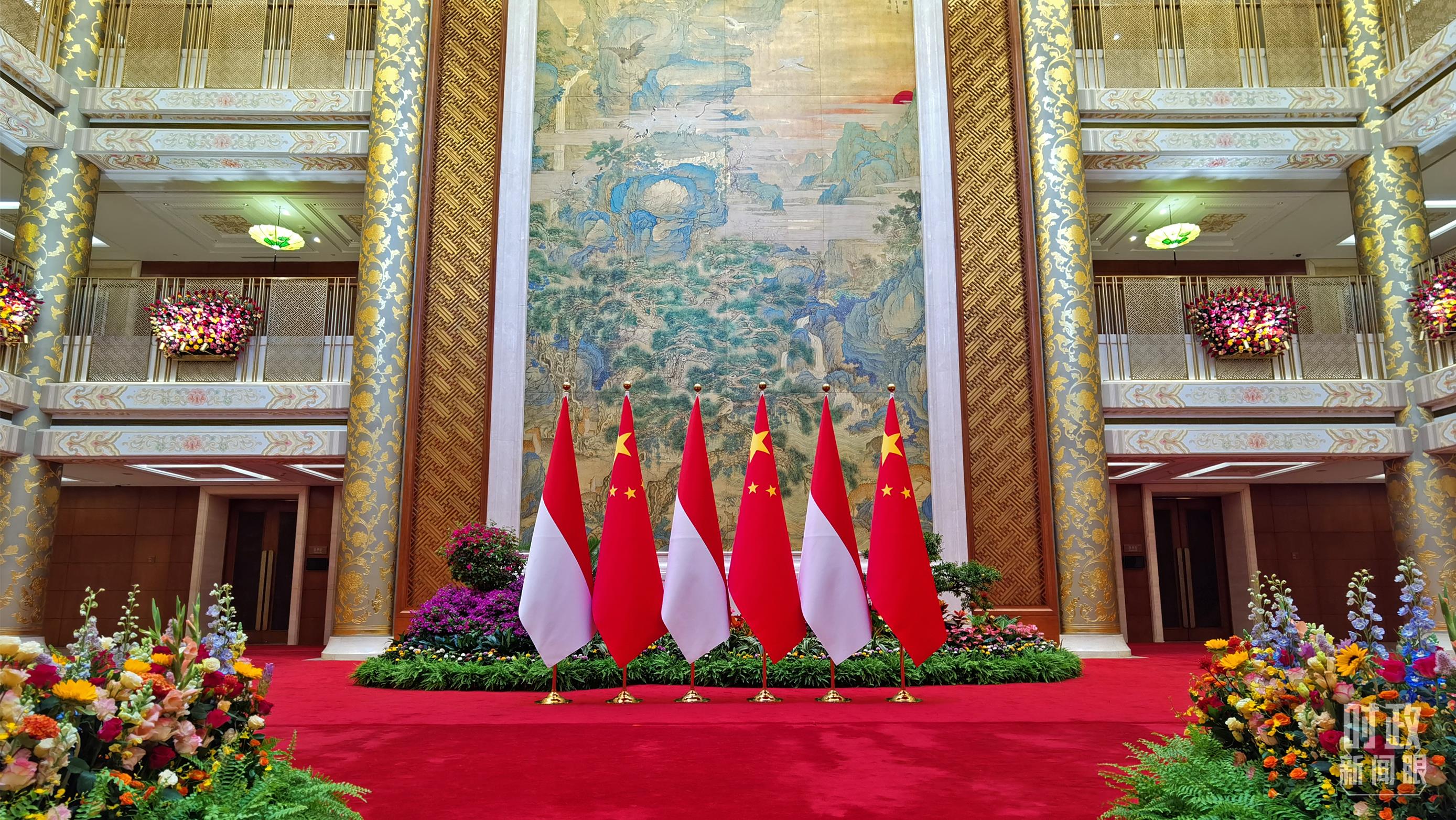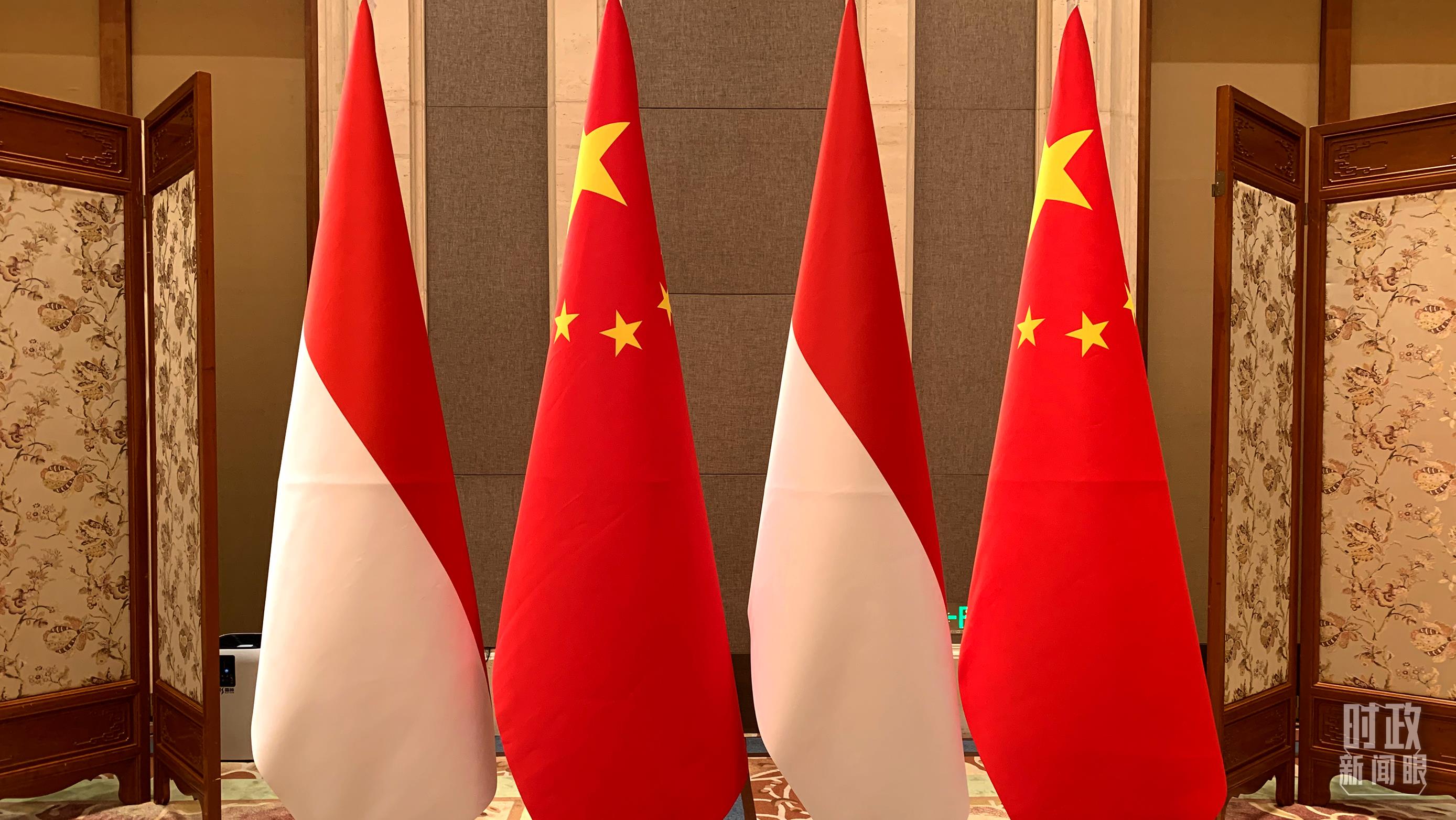 △會(huì)談現(xiàn)場的兩國國旗。(總臺(tái)央視記者范一鳴拍攝)