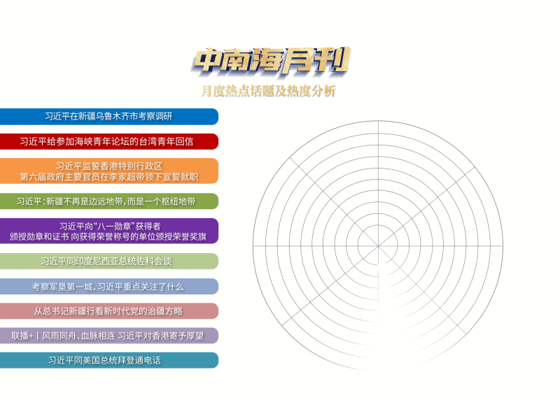 央視網(wǎng)“智聞”系統(tǒng)提取分析了2022年7月全網(wǎng)時政新聞熱點,總書記在新疆考察調(diào)研相關(guān)話題備受關(guān)注,與之相關(guān)聯(lián)的“習(xí)近平:新疆不再是邊遠地帶,而是一個樞紐地帶”“從總書記新疆行看新時代黨的治疆方略”“考察軍墾第一城,習(xí)近平重點關(guān)注了什么”等話題熱度很高。