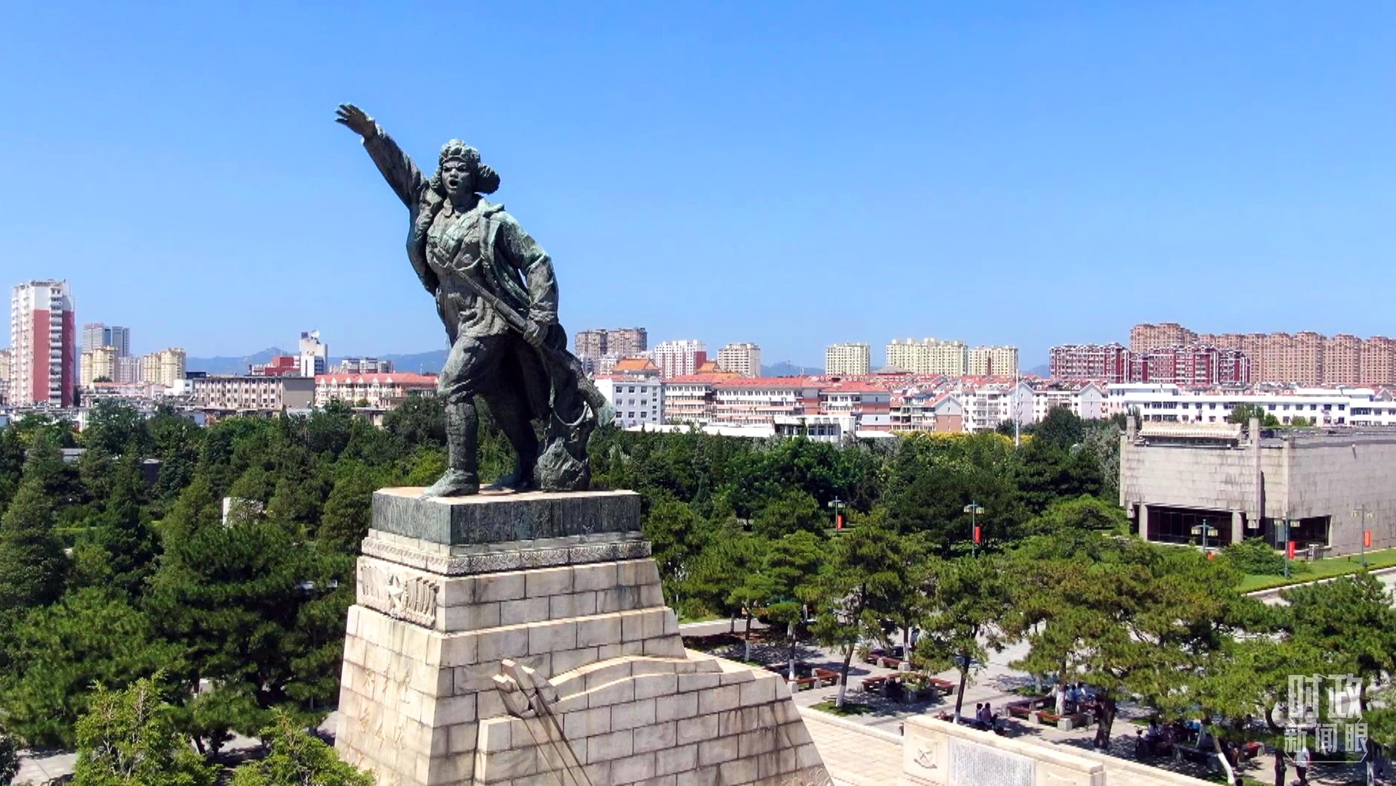△遼沈戰(zhàn)役革命烈士紀念塔,塔身高8米,塔頂是一座持槍振臂吶喊的解放軍戰(zhàn)士全身塑像。(總臺央視記者范凱拍攝)