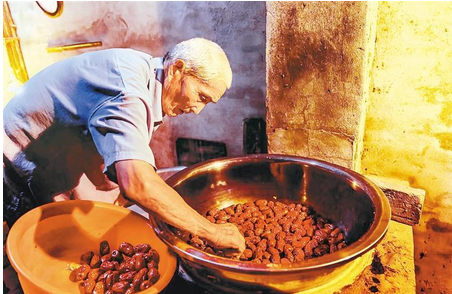 丁健榮老人正在往鍋底鋪棗