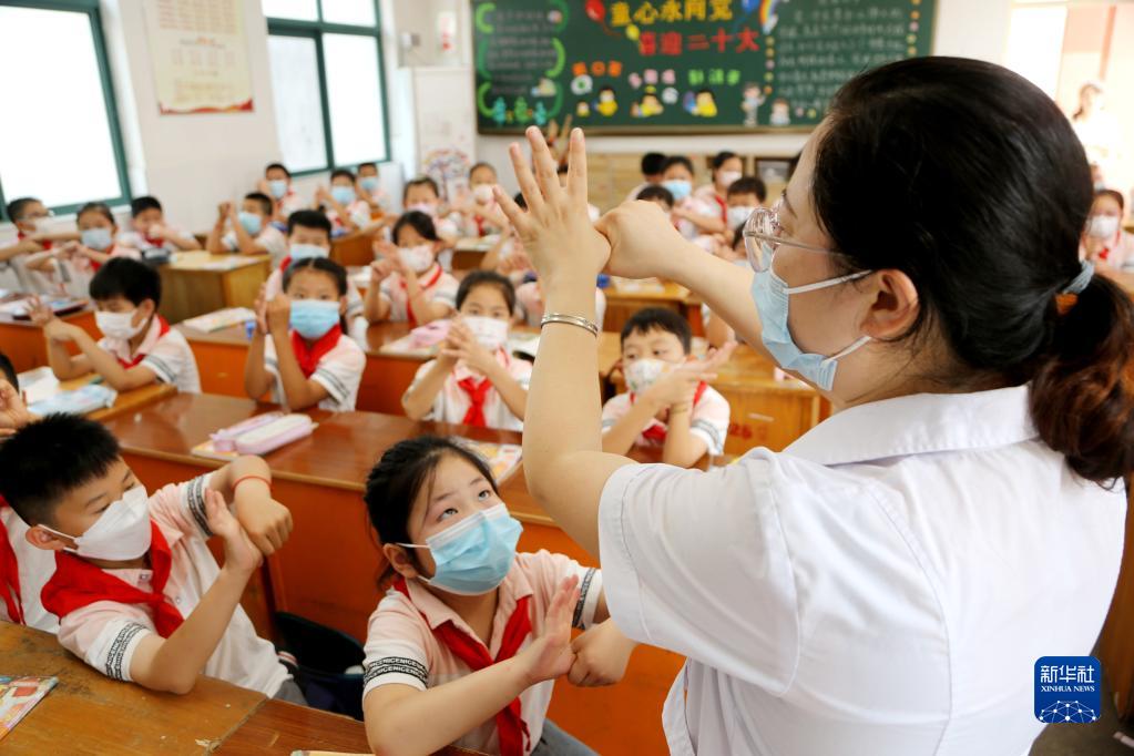 9月1日,在江蘇省連云港市院前小學(xué),校醫(yī)給學(xué)生講解正確的洗手方法。新華社發(fā)(王春 攝)