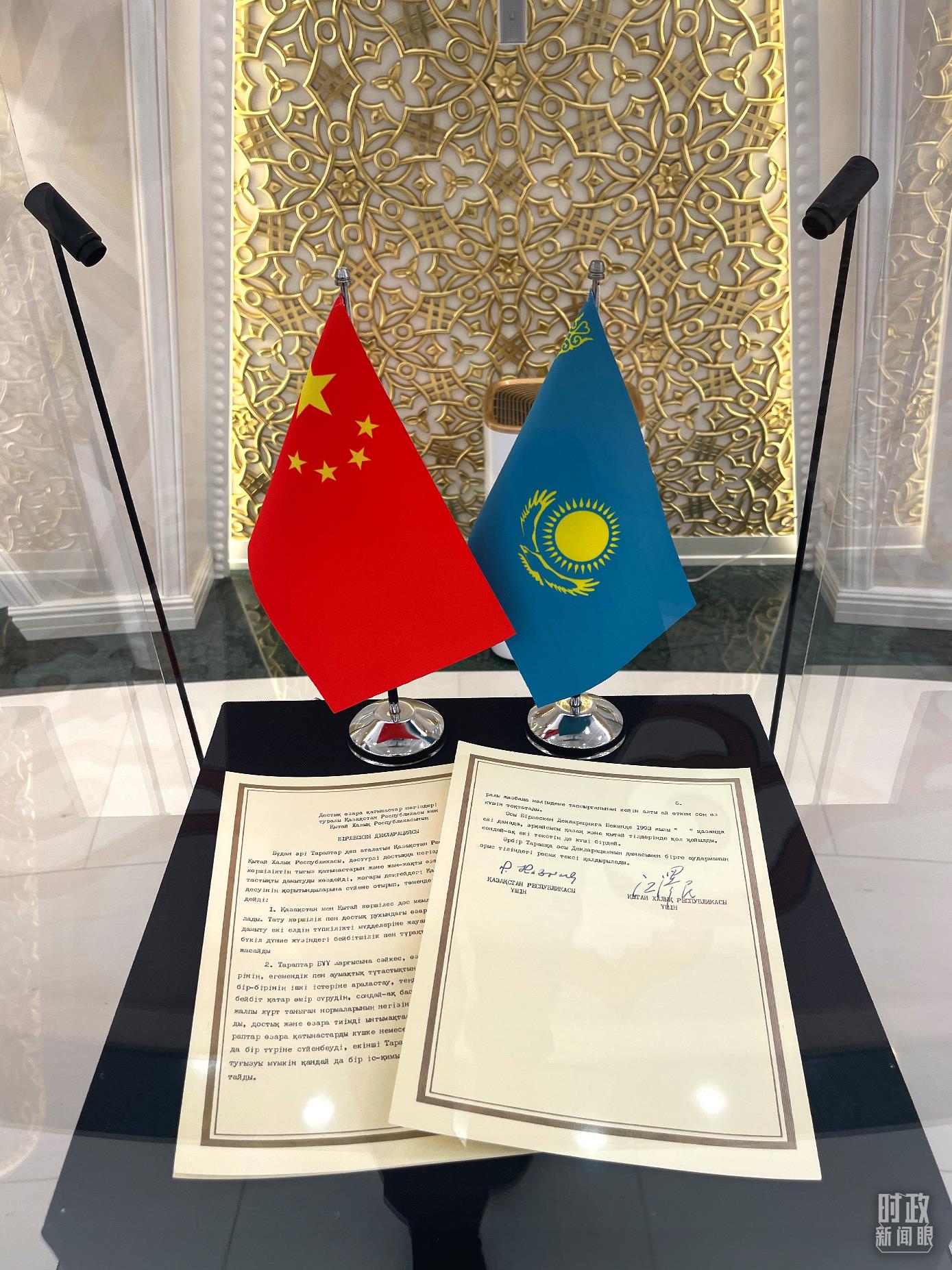 △1993年簽署的《關(guān)于中華人民共和國和哈薩克斯坦共和國友好關(guān)系基礎(chǔ)的聯(lián)合聲明》。(總臺央視記者鄂介甫拍攝)
