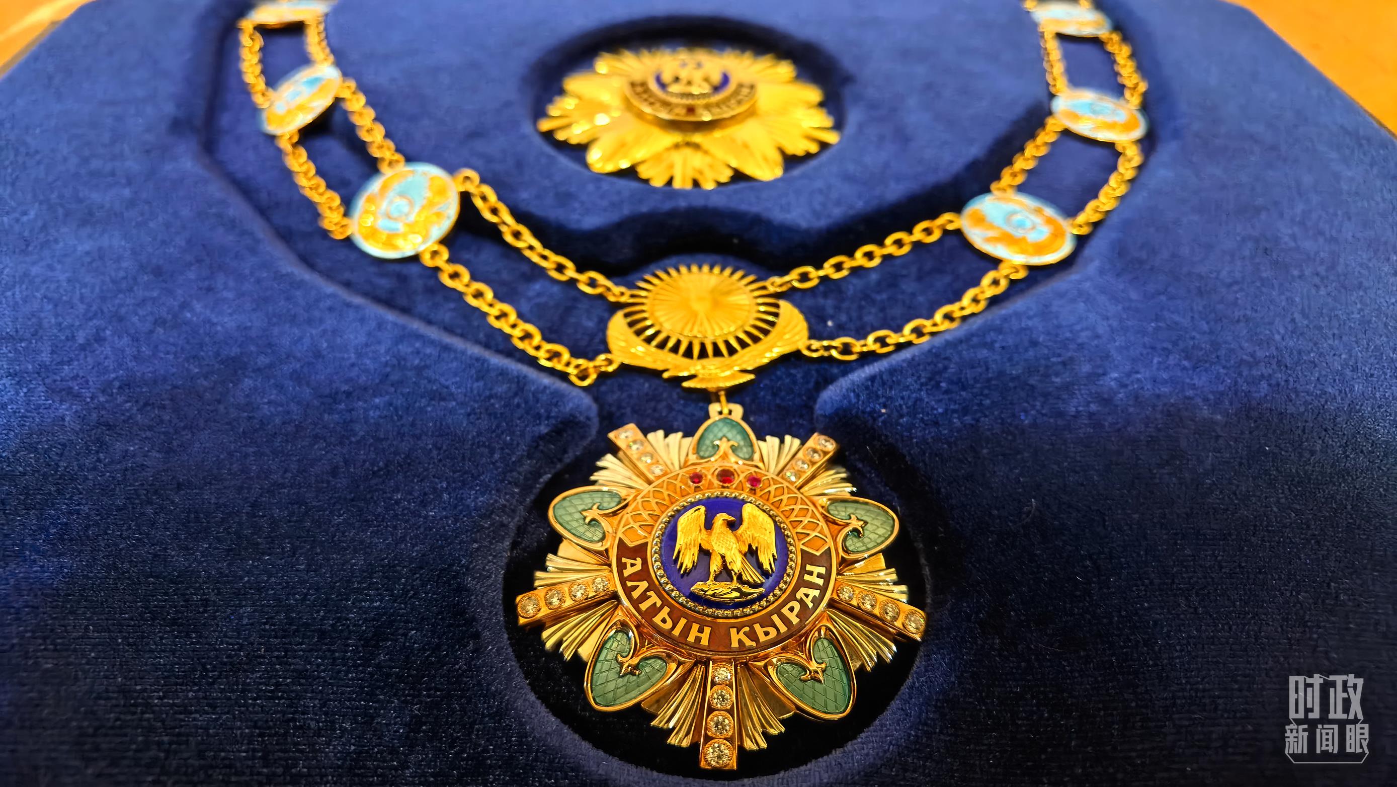 “金鷹”勛章設(shè)立于1995年,是哈薩克斯坦最高榮譽,旨在表彰為哈薩克斯坦國家建設(shè)和對外友好關(guān)系作出重大貢獻(xiàn)的人士。“金鷹”勛章一套兩枚,分為領(lǐng)綬和襟綬,兩枚勛章的中央都是一只金色的雄鷹。