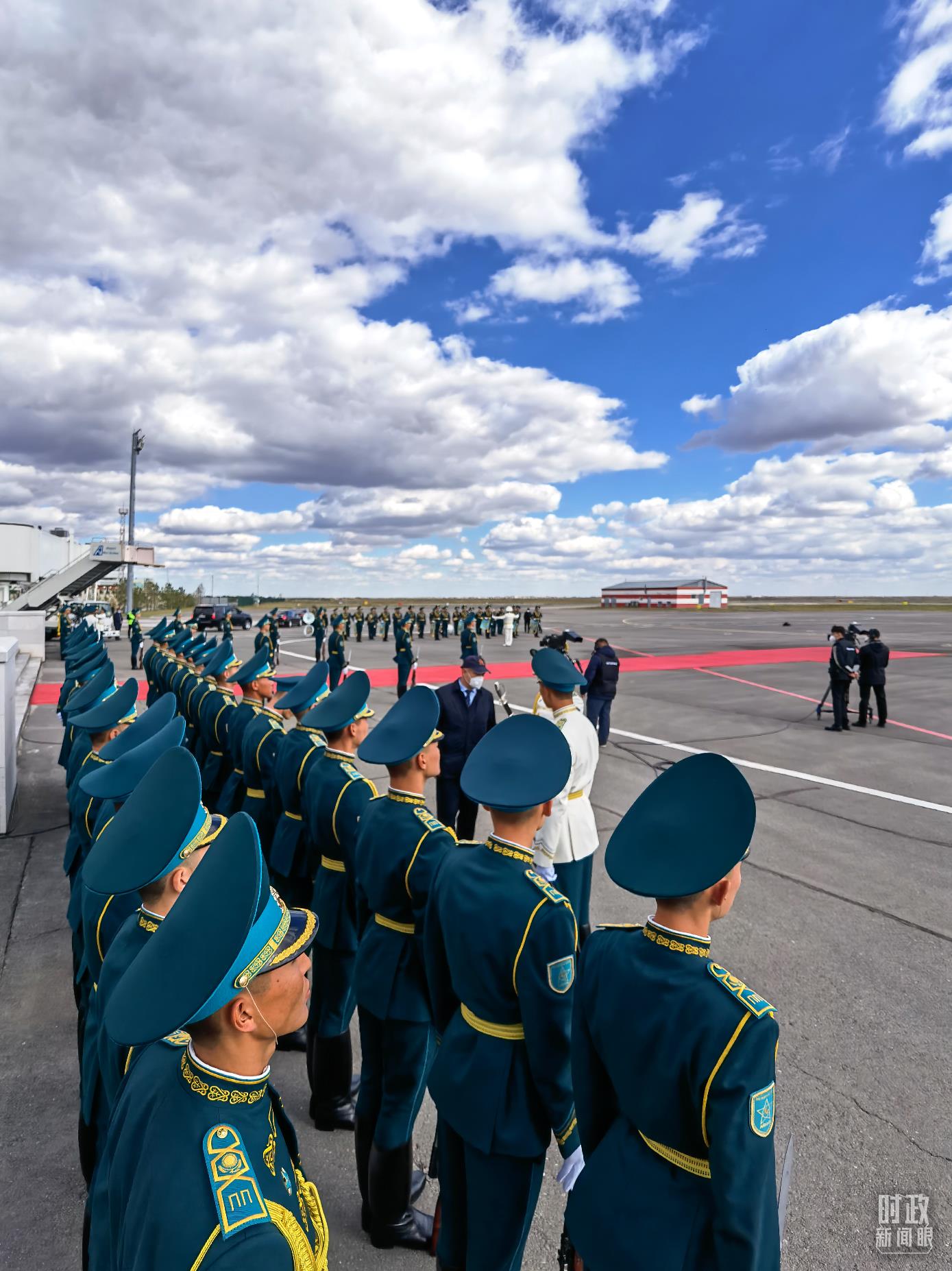 托卡耶夫總統(tǒng)親自前往機場迎接。現(xiàn)場70余名禮兵分列兩側(cè)致敬,軍樂團奏迎賓號角。
