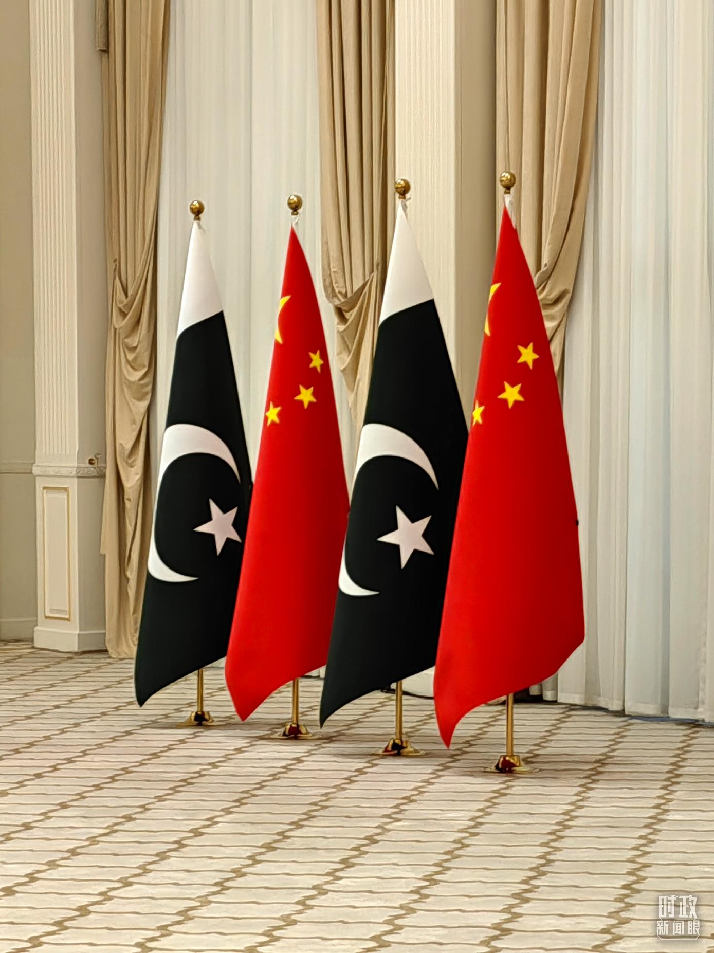 △中巴會(huì)見現(xiàn)場(chǎng)的兩國國旗。(總臺(tái)央視記者張曉鵬拍攝)