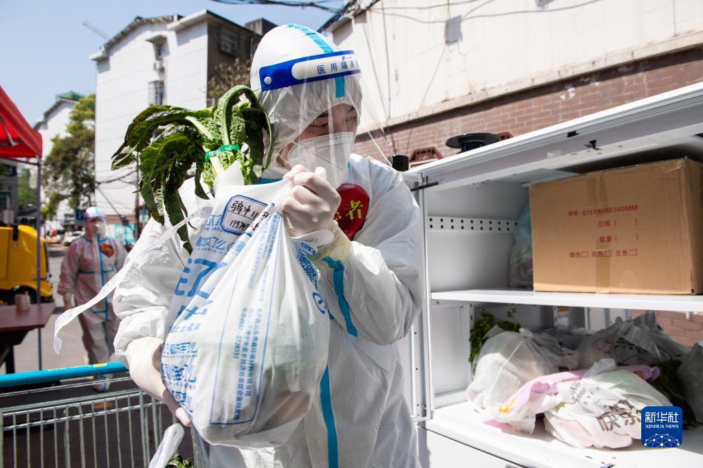 在湖南省長(zhǎng)沙市雨花區(qū)東塘街道楓樹山社區(qū),志愿者把生活物資放進(jìn)無人車,助力解決物資配送“最后一公里”問題(2022年4月7日攝)。新華社記者 陳思汗 攝