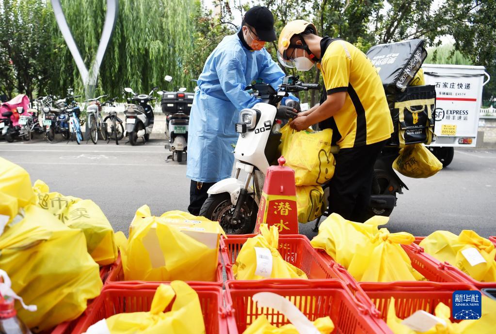 在河北省石家莊市裕華區(qū)一家超市保供點(diǎn),外賣人員在打包,準(zhǔn)備為市民送貨(2022年8月30日攝)。新華社記者 楊世堯 攝