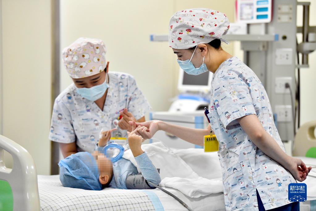 在山東省棗莊市婦幼保健院兒童ICU病房,醫(yī)護(hù)人員為完成靶向治療藥物諾西那生鈉的4歲脊髓性肌萎縮癥患兒加油鼓勁(2022年1月1日攝)。諾西那生鈉注射液是我國首個獲批治療脊髓性肌萎縮癥的進(jìn)口藥物,2019年進(jìn)入中國市場時,每針價格近70萬元。在2021年國家醫(yī)保目錄藥品談判中,以3.3萬元每針的價格進(jìn)入新版醫(yī)保藥品目錄。新華社記者 郭緒雷 攝