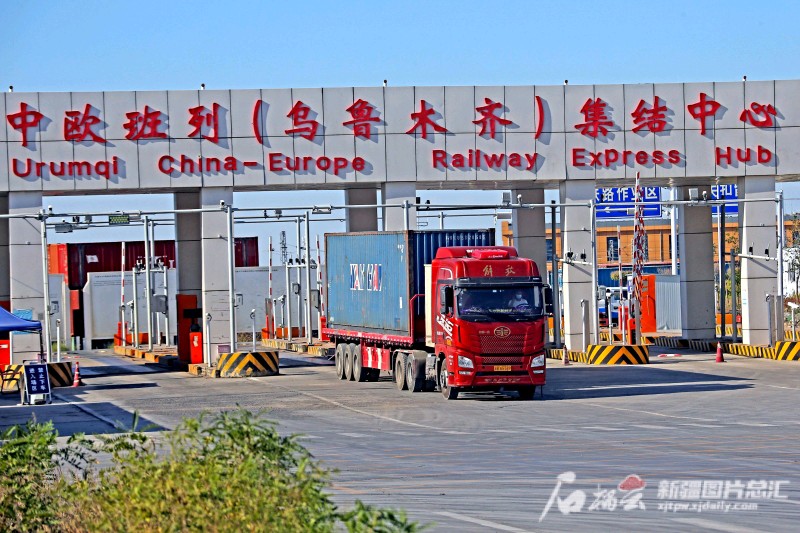 7月14日,一臺(tái)卡車(chē)從烏魯木齊國(guó)際陸港區(qū)中歐班列(烏魯木齊)集結(jié)中心駛出(資料圖片)。 石榴云/新疆日?qǐng)?bào)記者 蔡增樂(lè)攝