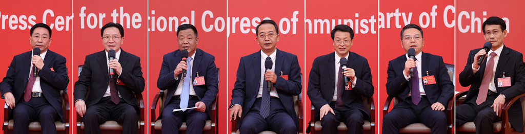 10月19日,中國共產(chǎn)黨第二十次全國代表大會(huì)新聞中心舉行集體采訪。山東、河南、湖北、湖南、廣東、廣西、海南代表團(tuán)新聞發(fā)言人出席,介紹代表團(tuán)學(xué)習(xí)討論二十大報(bào)告情況,并回答記者提問(拼版照片)。新華社記者 張玉薇 攝