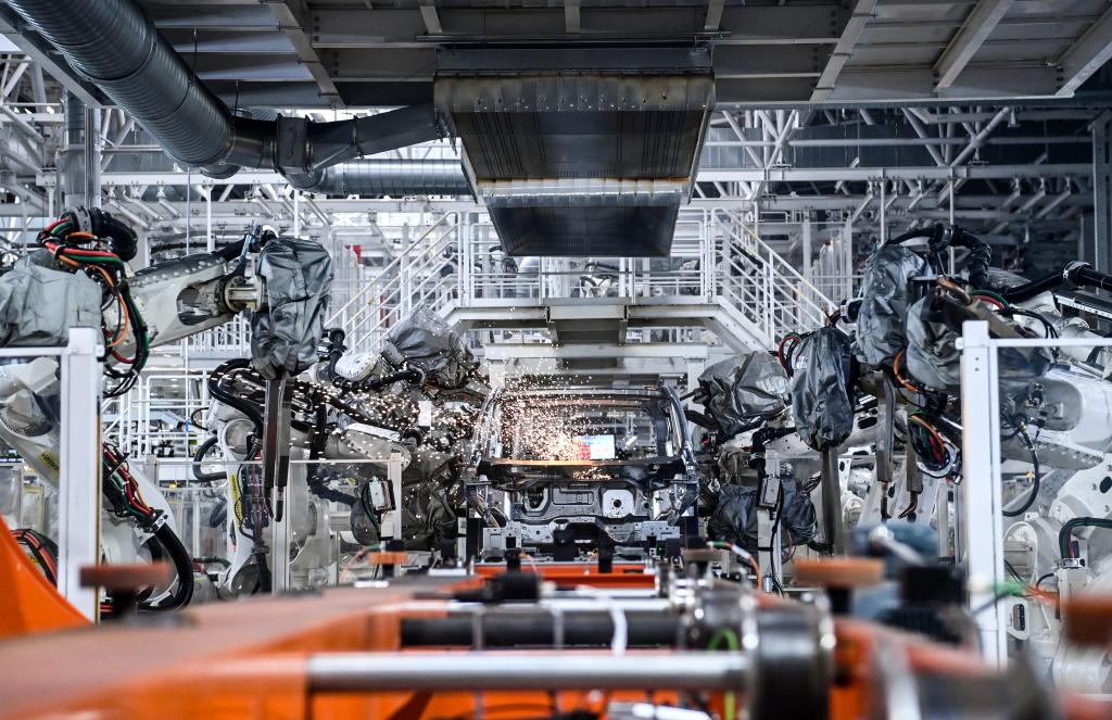 10月17日,在吉林長(zhǎng)春中國(guó)第一汽車集團(tuán)有限公司紅旗繁榮工廠焊裝車間內(nèi),焊裝機(jī)器人在生產(chǎn)線上焊接車身。新華社記者 顏麟蘊(yùn) 攝