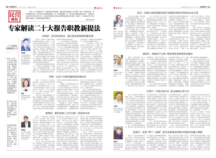 【《中國(guó)新聞》報(bào)記者 劉軍 報(bào)道】中共二十大報(bào)告對(duì)于“實(shí)施科教興國(guó)戰(zhàn)略,強(qiáng)化現(xiàn)代化建設(shè)人才支撐”進(jìn)行了詳細(xì)豐富、深刻完整的論述,其中有許多創(chuàng)新的提法,如“職普融通”和“優(yōu)化職業(yè)教育類型定位”均是首次出現(xiàn)在黨代會(huì)的文件中。本報(bào)記者就此采訪職業(yè)教育領(lǐng)域的多位專家,解讀二十大報(bào)告中關(guān)于發(fā)展職業(yè)教育、培養(yǎng)高技能的新提法。