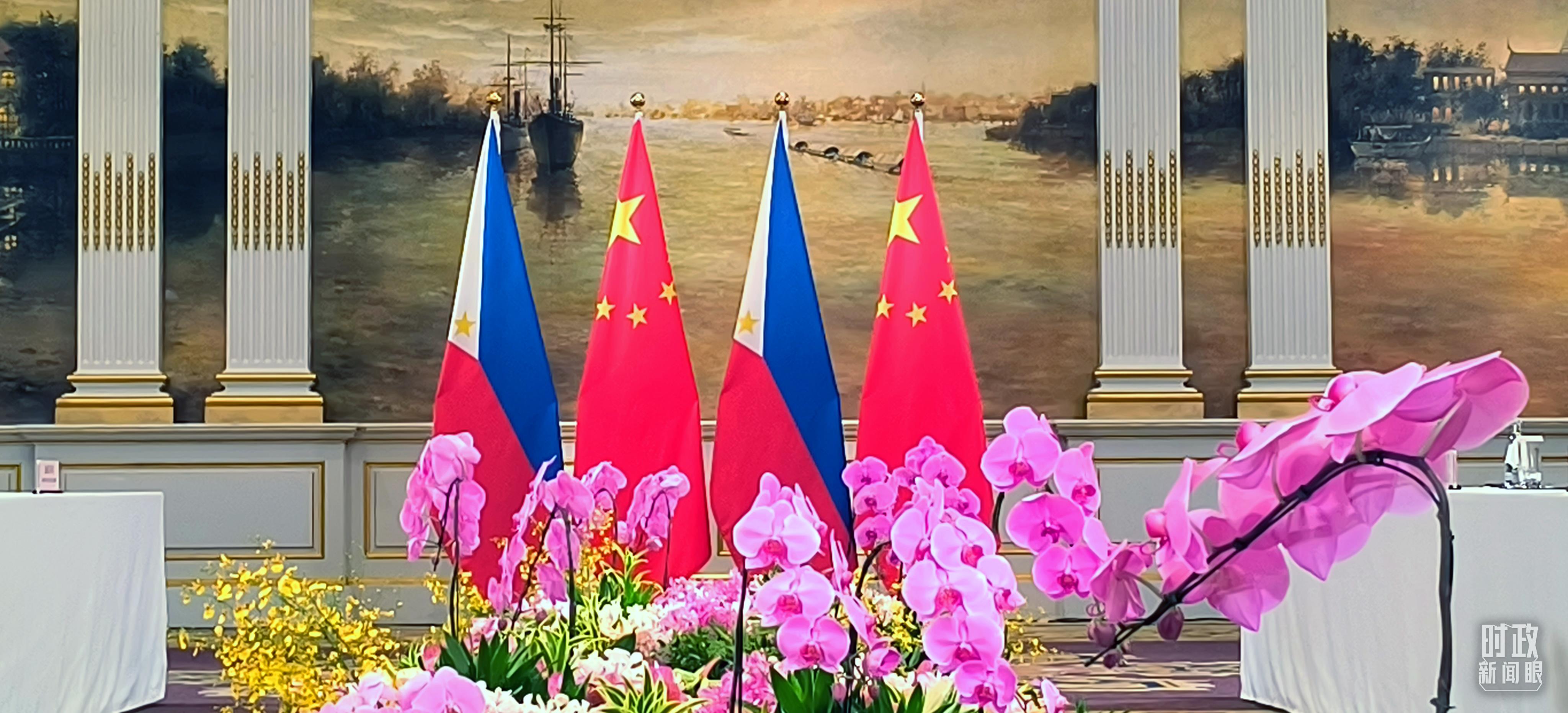 △會談現(xiàn)場的中菲兩國國旗。(總臺央視記者范凱拍攝)