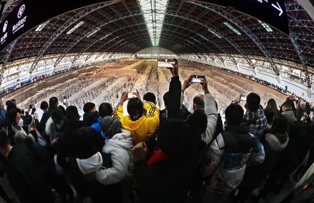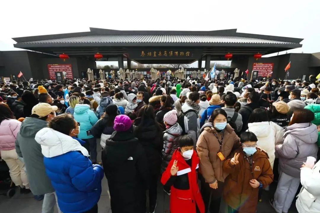 1月23日(大年初二),秦始皇帝陵博物院迎來了最大承載量,來自全國各地的觀眾參觀熱情高漲,該院內外重現(xiàn)了久別的客流高峰。兵馬俑園區(qū)人山人海,熙熙攘攘,觀眾都在有序排隊進行參觀。13時,秦始皇帝陵博物院已經達到最大承載量,所有門票售罄,院方充分感受到了大家的熱情。
