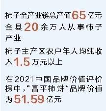 種植面積36萬(wàn)畝、掛果面積18萬(wàn)畝,鮮柿產(chǎn)量28萬(wàn)噸,加工柿餅7萬(wàn)噸,銷(xiāo)售柿餅6萬(wàn)噸以上,柿子全產(chǎn)業(yè)鏈產(chǎn)值達(dá)65億元……