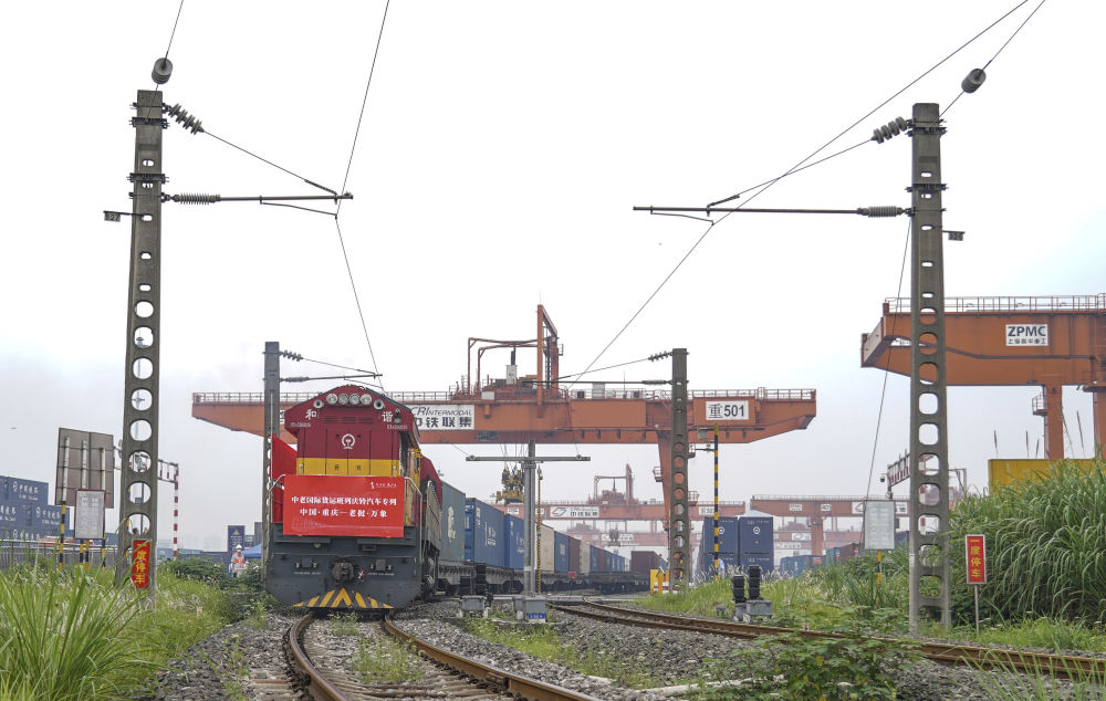 中老國際貨運班列慶鈴汽車專列從重慶團(tuán)結(jié)村車站駛出(2022年6月8日攝)。新華社記者 黃偉 攝
