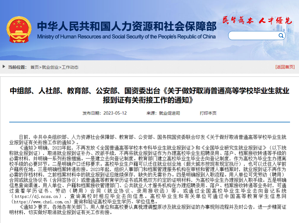 日前,中共中央組織部、人力資源社會保障部、教育部、公安部、國務(wù)院國資委聯(lián)合印發(fā)《關(guān)于做好取消普通高等學(xué)校畢業(yè)生就業(yè)報到證有關(guān)銜接工作的通知》。