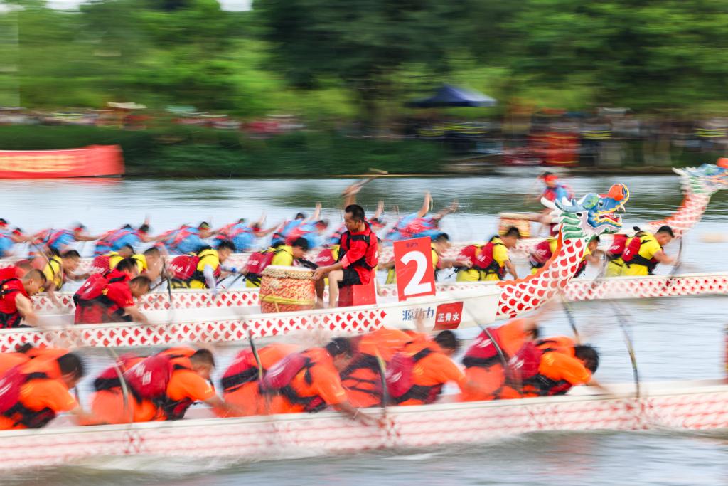 6月20日,在廣西玉林園博園,選手進(jìn)行龍舟競(jìng)賽。新華社記者 胡星宇 攝