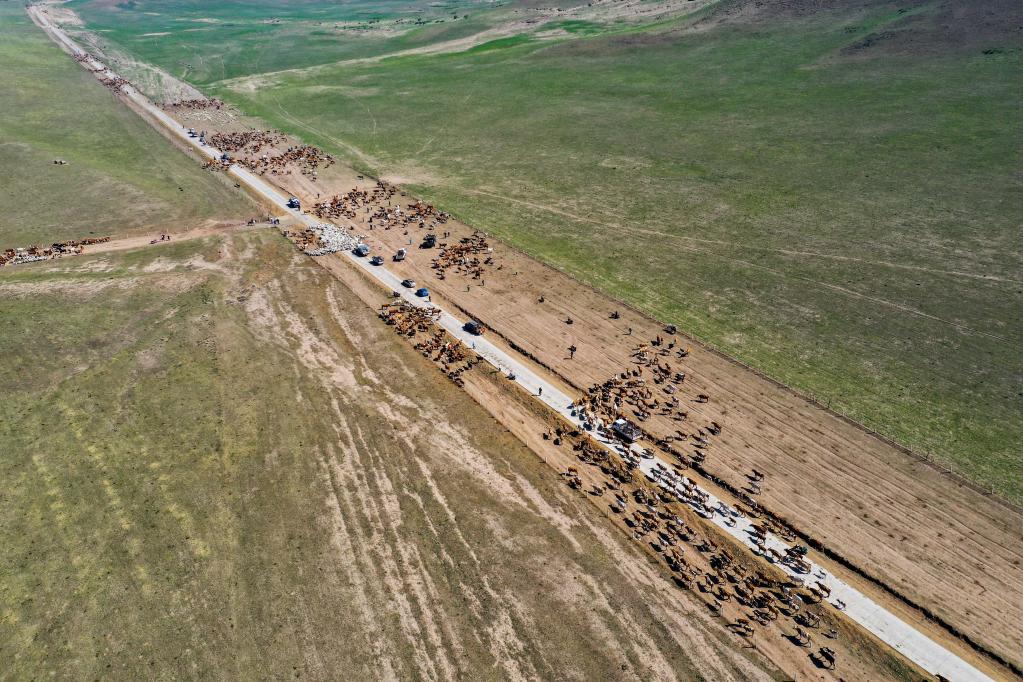 6月15日,牧民們趕著畜群行走在遷徙道路上(無(wú)人機(jī)照片)。新華社記者 連振攝