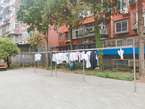 走出古城南路社區(qū)東門,沿古城東街北行400余米右轉(zhuǎn)進(jìn)入八角北路社區(qū),只見幾株高大的國(guó)槐及道邊的綠藤錯(cuò)落有致。再向里走,是一塊寬闊的活動(dòng)場(chǎng)地,北側(cè)建有一排不銹鋼晾衣架,架上晾滿了衣服。“有居民提出家里陽(yáng)臺(tái)上晾衣服不方便,我們特地尋找合適地方,為這些社區(qū)建了晾衣架。”北京石房物業(yè)有限公司(以下簡(jiǎn)稱石房物業(yè))副經(jīng)理孫偉說(shuō)。