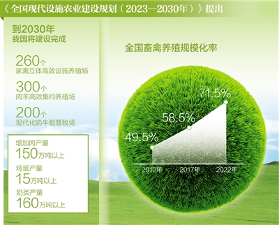 規(guī)?;O(shè)施化養(yǎng)殖助推畜牧業(yè)綜合產(chǎn)能提升?!度珖F(xiàn)代設(shè)施農(nóng)業(yè)建設(shè)規(guī)劃(2023—2030年)》(以下簡稱《規(guī)劃》)提出,到2030年建設(shè)完成260個家禽立體高效設(shè)施養(yǎng)殖場、200個肉牛高效集約養(yǎng)殖場、300個肉羊高效集約養(yǎng)殖場和200個現(xiàn)代化奶牛智慧牧場,增加肉產(chǎn)量150萬噸以上、雞蛋產(chǎn)量15萬噸以上、奶類產(chǎn)量160萬噸以上,我國的肉蛋奶供應(yīng)保障水平將進(jìn)一步提高。