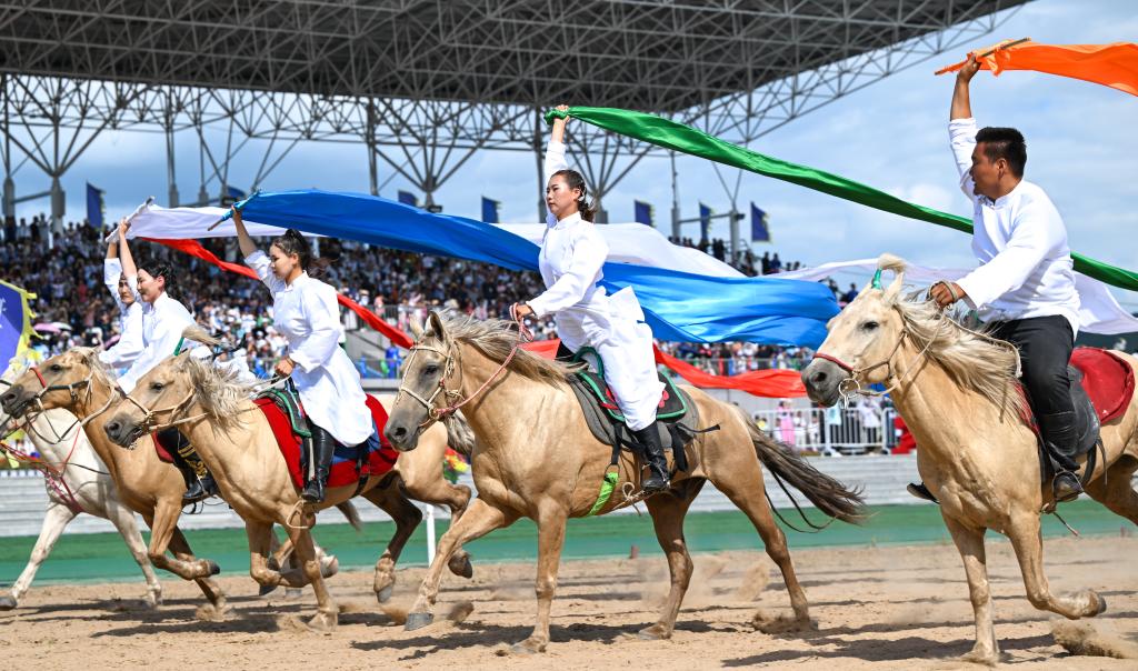 8月9日,2023興安盟那達慕在烏蘭毛都草原開幕,這是演員在開幕式上進行表演。新華社記者 貝赫 攝