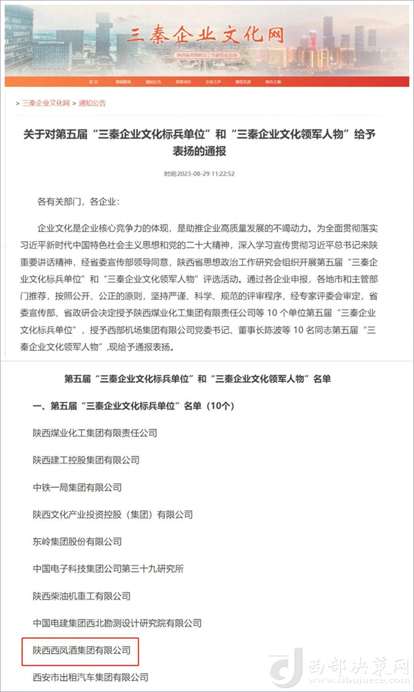 西部決策網(wǎng)訊(記者劉玉 韓宗憲 通訊員 馬迪)近日,從陜西省委宣傳部、陜西省思想政治工作研究會(huì)傳來喜訊,西鳳集團(tuán)公司以在企業(yè)文化建設(shè)方面的突出成績,從眾多評(píng)選單位中脫穎而出,獲得“三秦企業(yè)文化標(biāo)兵單位”光榮稱號(hào)。