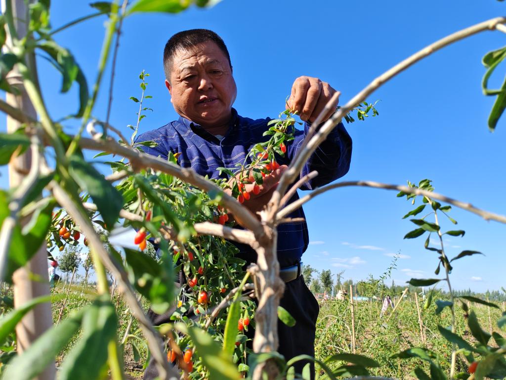 9月21日,精河縣托里鎮(zhèn)吾夏克巴依西村杞農(nóng)查看枸杞生長(zhǎng)情況。新華社記者 茍立鋒 攝