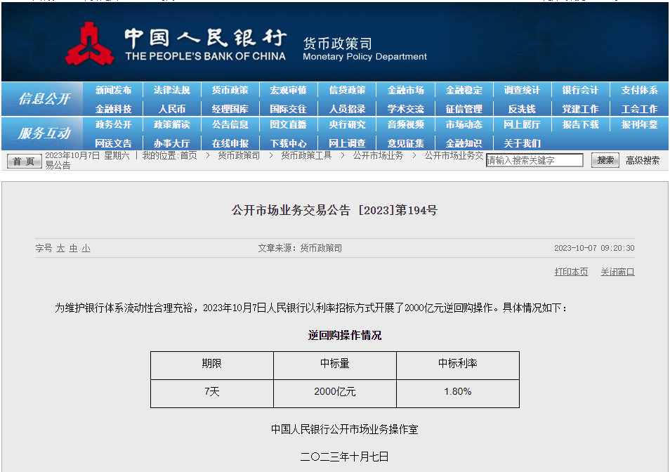 據(jù)中國(guó)人民銀行網(wǎng)站公告,10月7日,央行以利率招標(biāo)方式開展2000億元逆回購(gòu)操作,期限為7天,中標(biāo)利率為1.80%,與此前持平。
