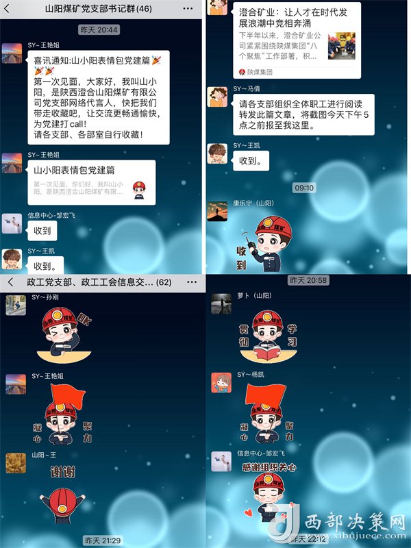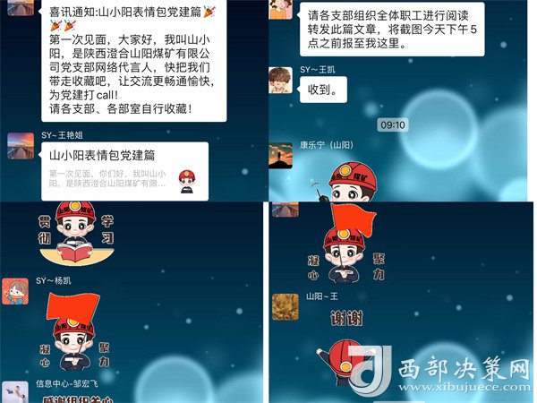 據(jù)了解,“山小陽”表情包一經(jīng)上線,便博得了干部職工的喜愛、互動、熱議以及推廣,“山小陽”表情包涵蓋“為支部爭光、上黨課啦、交黨費啦、注意安全、感謝組織關(guān)心.......”等交流常用的表情,他們身穿帶有山陽煤礦標(biāo)識的工作服,頭戴安全帽,或微笑、或調(diào)皮、或嚴(yán)肅,多個動作,在微信平臺、微信工作群中任大家選擇和使用,促使山陽黨建文化以更加新穎的形式走進(jìn)黨員、干部職工的工作和生活中去,以接地氣、潛移默化的形式讓黨支部標(biāo)準(zhǔn)化建設(shè)工作入腦入心、見行見效。