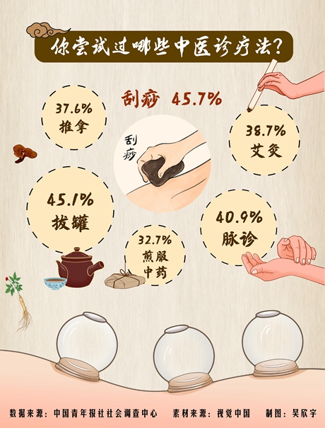 刮痧、拔罐、脈診是受訪青年最常體驗的中醫(yī)養(yǎng)生項目