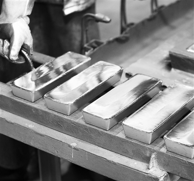 圖② 在有色金屬冶煉廠,工人在碼放剛剛制成的金條。