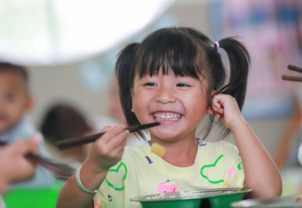 ↑貴州省從江縣剛邊壯族鄉(xiāng)中心幼兒園的小朋友在享用免費(fèi)營(yíng)養(yǎng)午餐(9月15日攝)。