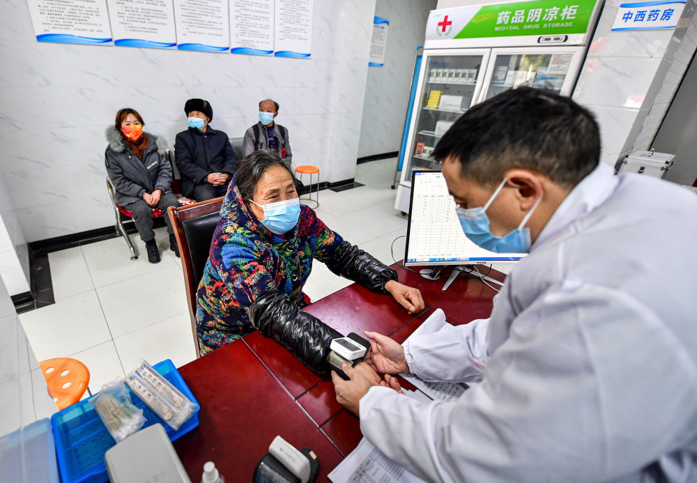 ↑四川省綿陽(yáng)市北川縣曲山鎮(zhèn)任家坪村、石椅村聯(lián)合衛(wèi)生室村醫(yī)趙太安(右一)在村衛(wèi)生室為前來(lái)問(wèn)診的村民測(cè)量血壓(1月19日攝)。