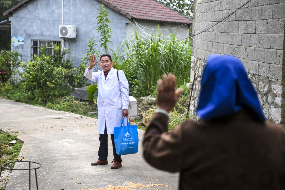 ↑廣西貴港市港北區(qū)大圩鎮(zhèn)中西村,村醫(yī)黃增亮(左)出診結(jié)束后與村民揮手告別(11月29日攝)。