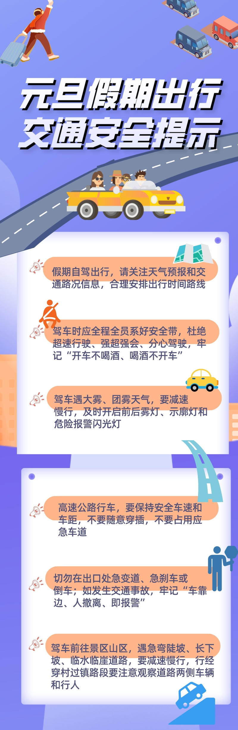 公安部結(jié)合近三年元旦假期道路交通出行和交通事故規(guī)律特點(diǎn),分析研判2024年元旦假期道路交通安全形勢(shì)。據(jù)研判,元旦假期旅游客運(yùn)安全風(fēng)險(xiǎn)突出,跨年賀歲活動(dòng)多,溫泉游、滑雪游、農(nóng)家樂等旅游出行頻繁,多家在線旅游平臺(tái)元旦假期旅游訂單量同比增長(zhǎng)超3倍,旅游客運(yùn)、公路客運(yùn)、自駕車超員載客、超速行駛等違法肇事易發(fā)多發(fā)。
